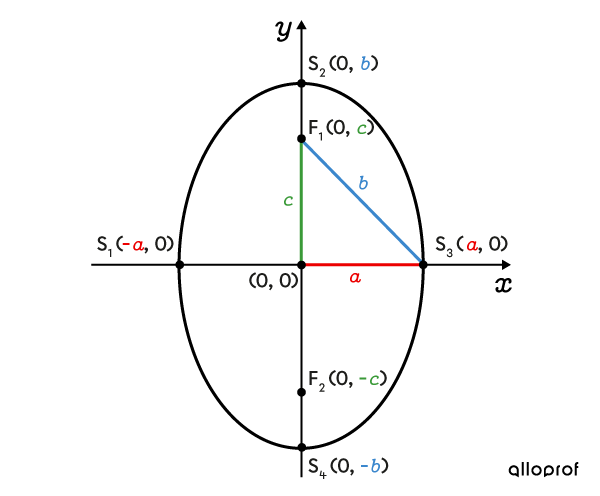 L'équation qui définit l'ellipse centrée à l’origine utilise les paramètres \(a\) et \(b\).