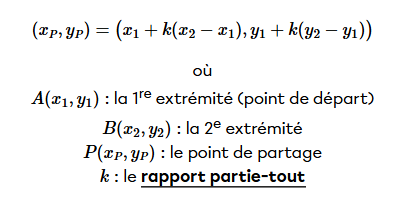 Cette fiche présente plusieurs exemples de calcul qui pourraient t'aider : Le point de partage et le point milieu d'un segment | Secondaire | Alloprof
