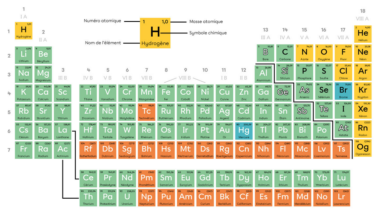 Ex. L'élément #1, H, possède une masse atomique de 1,01. Si on passe au numéro 2, He, il a une masse atomique de 4,00. Lorsque le numéro atomique augmente (1 à 2), la masse atomique augmente aussi (1,01 à 4,00), alors ça respecte la règle! Continue avec cette méthode en vérifiant bien qu'à chaque fois que tu montes de numéro, ça monte de masse atomique, et tu obtiendras ta réponse, il y a un atome qui ne respectera pas cela. Une indice, j'ai encerclé la zone proche de l'élément en question.