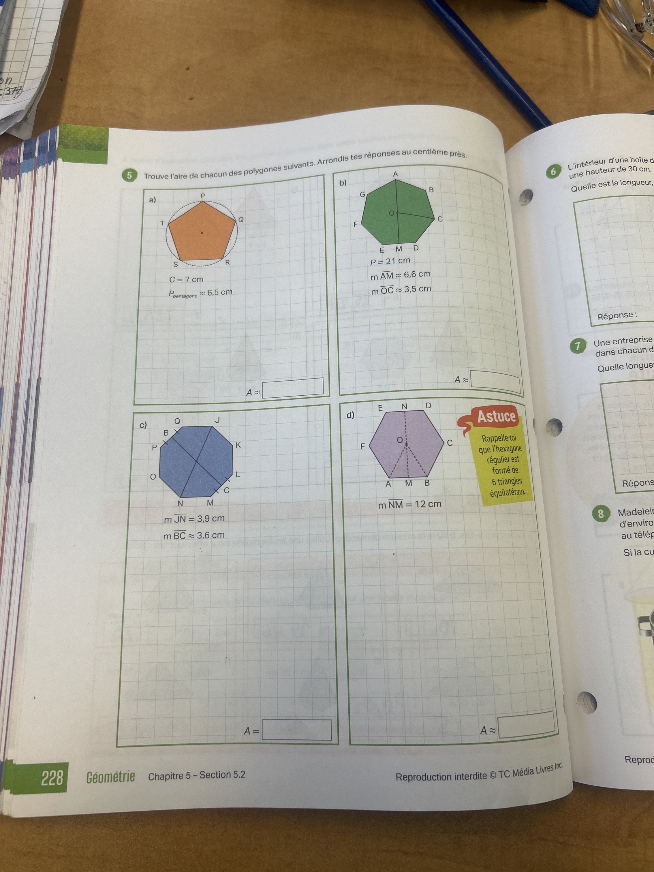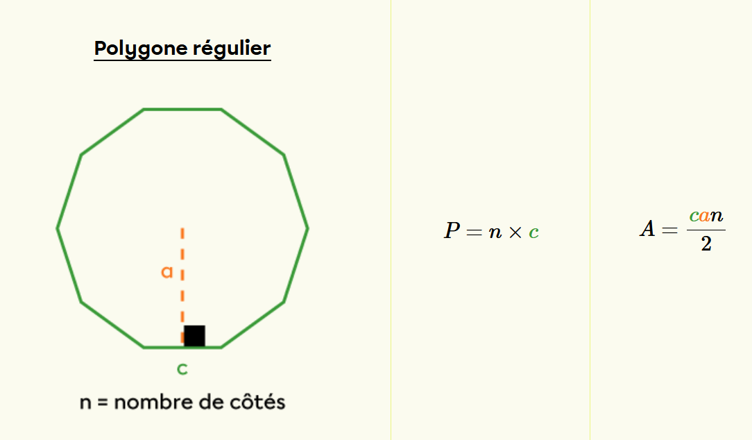 Identifie bien sur tes figures l'apothème (a) et la mesure de côté (c) à l'aide des nombres fournis.