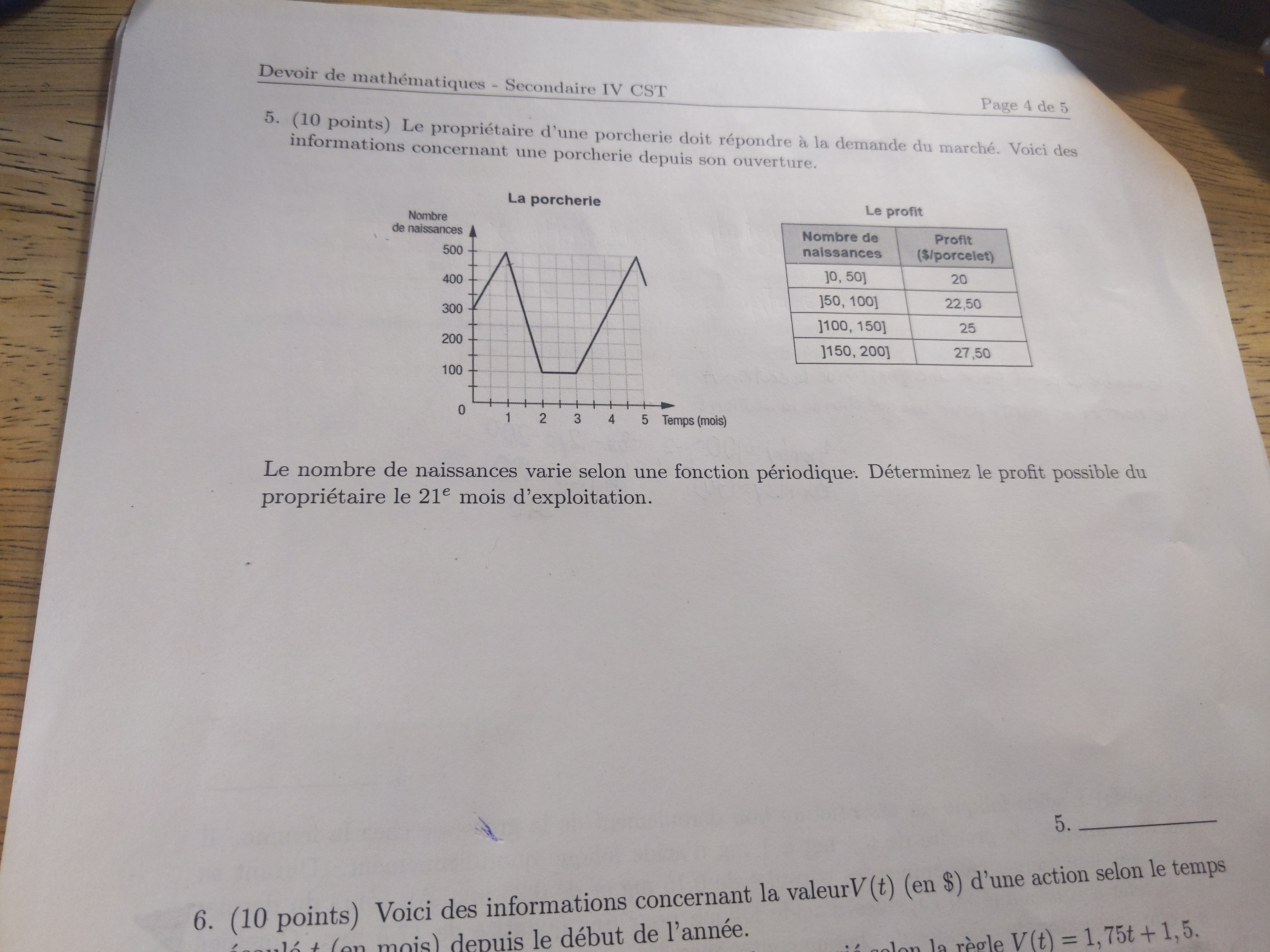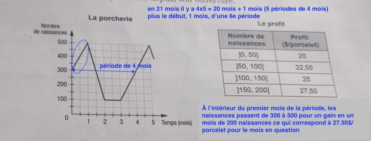 Note : Le tableau nous donne le profit par nombre de naissances mais n'est pas défini pour plus de 200 naissances. On peut supposer que la progression continue de la même façon mais ce n'est pas garanti. On pourrait s'attendre à ce que le profit soit au moins de 27.50$/porcelet. Mais il peut y avoir saturation du marché