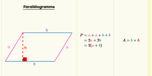 Voici les formules de périmètre et d'aire d'un parallélogramme :