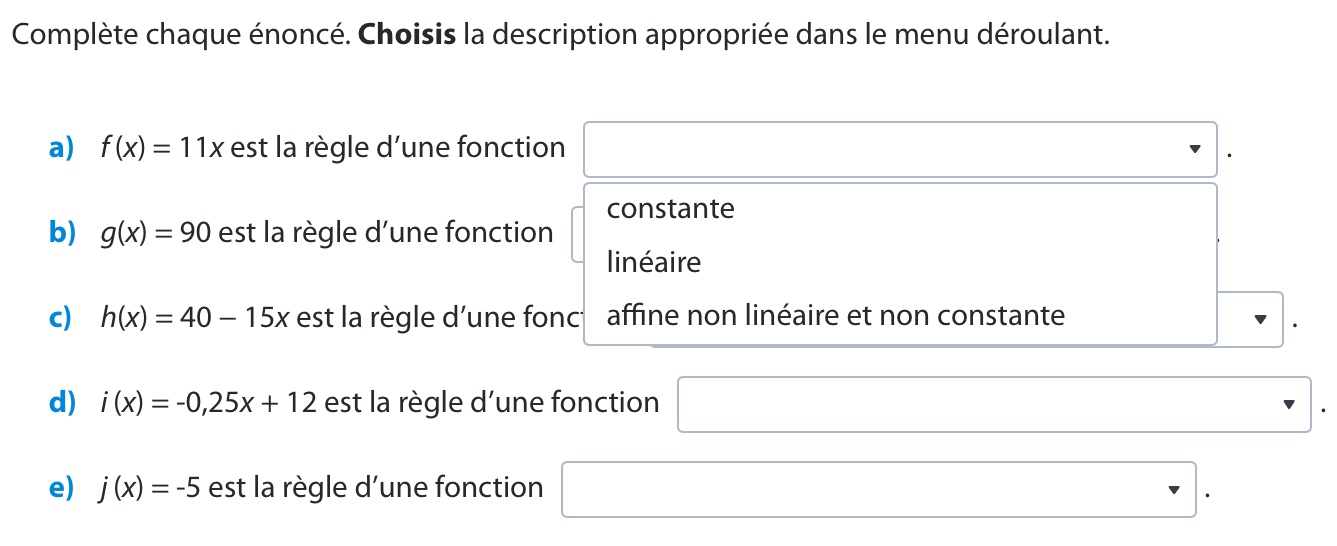Ainsi, pour résoudre ton exercice, tu dois regarder si la règle possède un taux de variation et si elle possède une ordonnée à l'origine. Si elle possède ces deux éléments, alors il s'agit d'une fonction de variation partielle (choix numéro 3). Si elle possède une pente mais ne possède pas d'ordonnée à l'origine, alors c'est une fonction linéaire (choix numéro 2). Finalement, si elle possède une ordonnée à l'origine mais ne possède pas une pente, alors c'est une fonction constante (choix numéro 1).