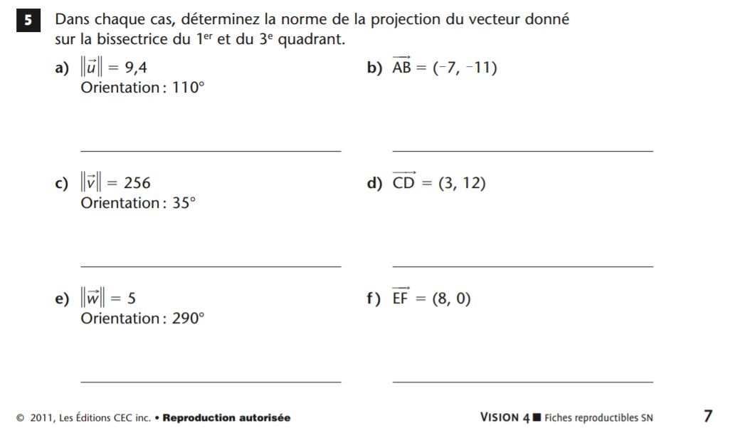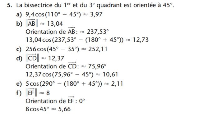 Pour répondre à ces questions, je te conseille de tracer tes vecteurs et la bissectrice en question, ça facilite grandement la compréhension. Le vecteur et la bissectrice forment les deux côtés d'un triangle, le vecteur est l'hypoténuse et la bissectrice est la base. Tu peux trouver l'angle entre les deux à partir des informations de chacun des énoncés. À l'aide du module du vecteur, c'est-à-dire la longueur de l'hypoténuse, et de l'angle entre chaque côté, tu peux trouver la longueur de la base d'un triangle rectangle si une hauteur est rajoutée pour compléter la figure.