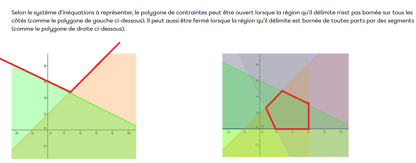 Tout d'abord, un polygone de contraintes est borné si tous ces côtés sont bien délimités par des droites (polygone de droite). S'il est ouvert et s'étend à l'infini (polygone de gauche), alors il n'est pas borné.
