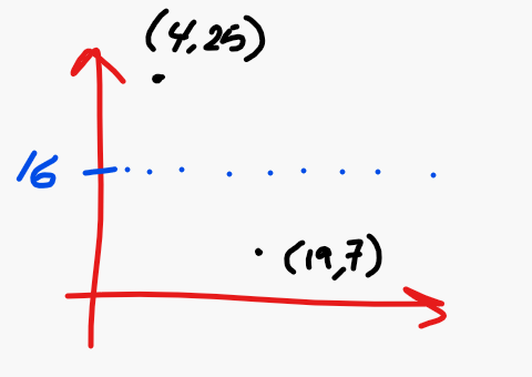 Si on veut faire une esquisse rapide de la situation, on peut placer notre maximum et notre minimum (que l'énoncé nous donne), ainsi que l'axe d'oscillation qu'on peut déduire facilement (25+7 /2), comme ceci :