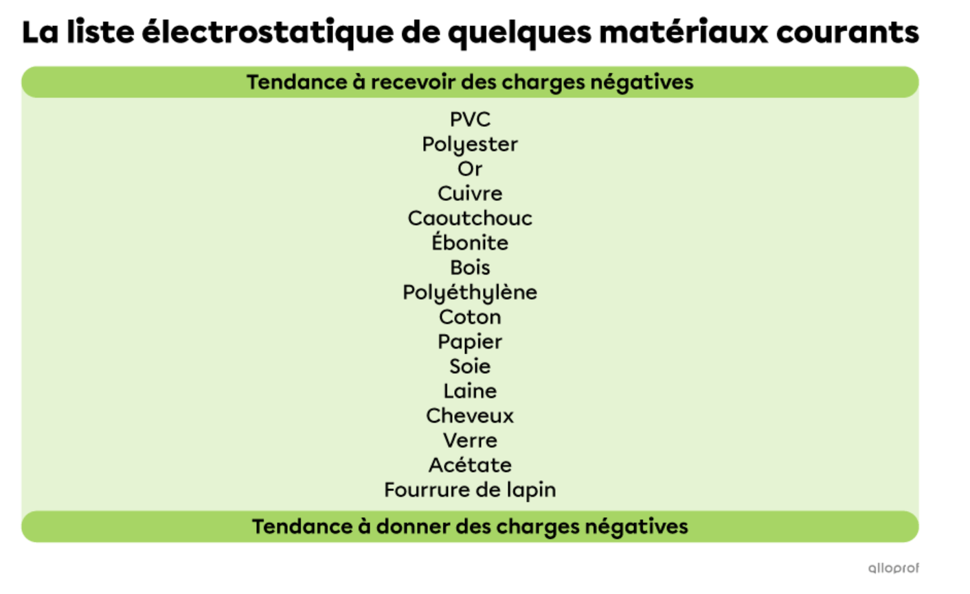 Tous les types de plastique indiqués (PVC, polyester, polyéthylène) ont plus tendance à recevoir des charges négatives que les cheveux.