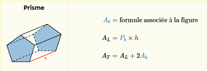Pour calculer l'aire de ce prisme, tu auras besoin de cette formule :