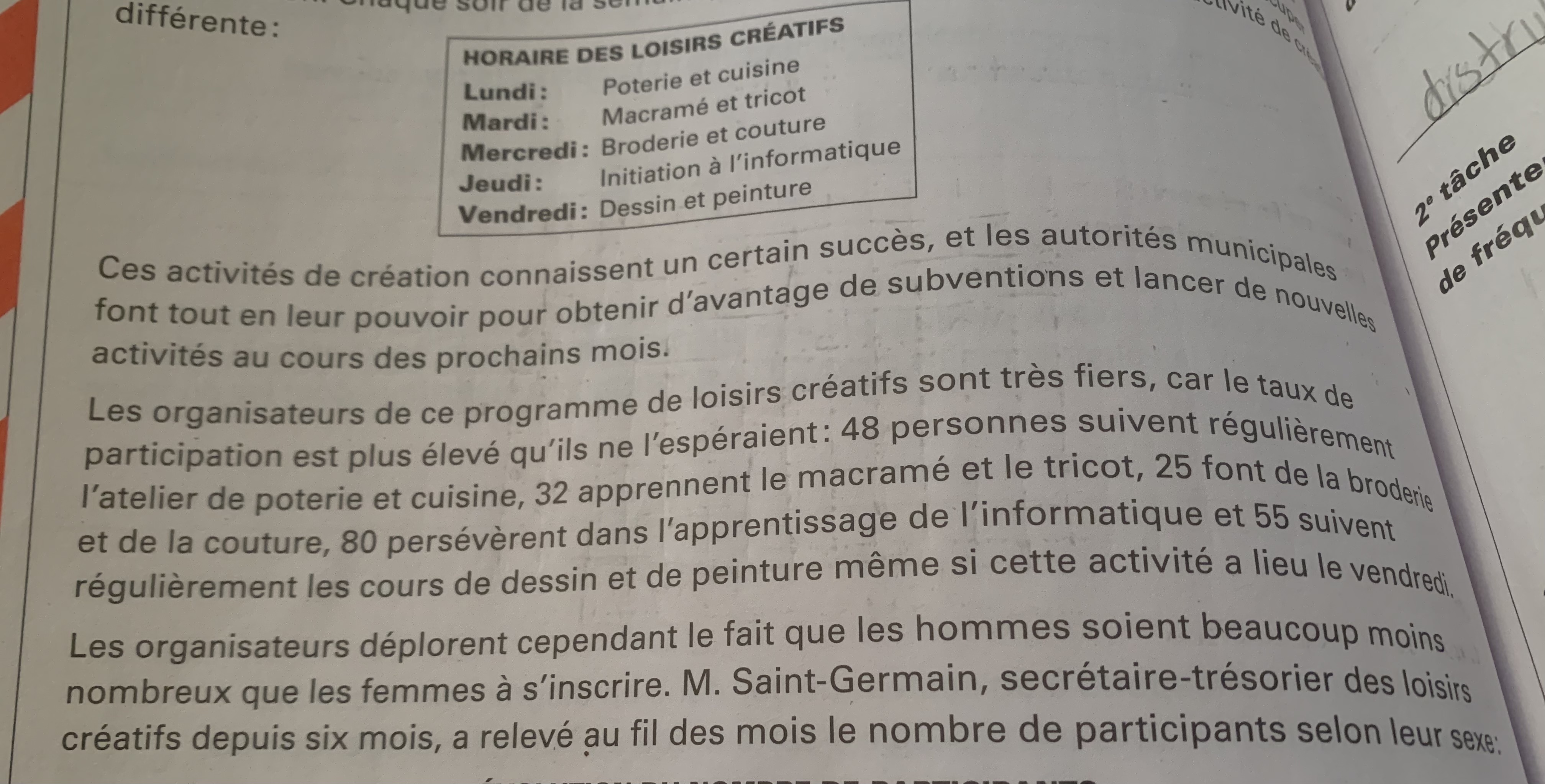 Ainsi, tu auras un tableau avec deux colonnes: une colonne représentera le nom de chaque activité et la deuxième, la fréquence relative qui y est associée.