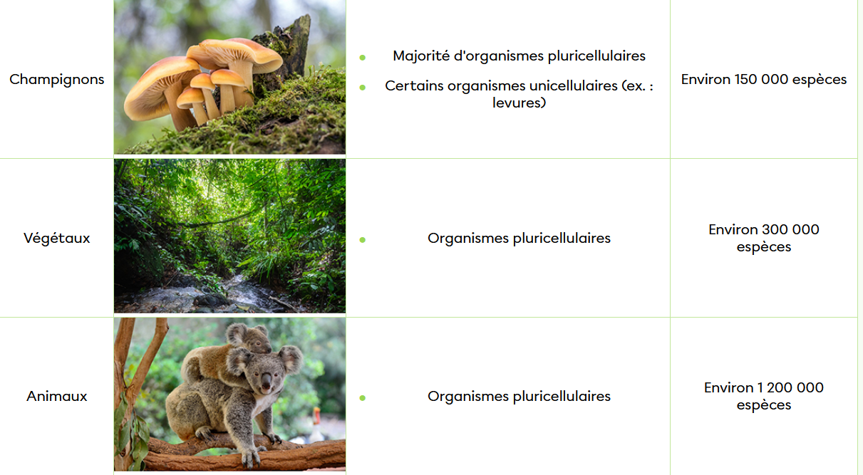 L'important est de mémoriser les grands règnes du vivant : animaux, végétaux, champignons, protistes et monères.