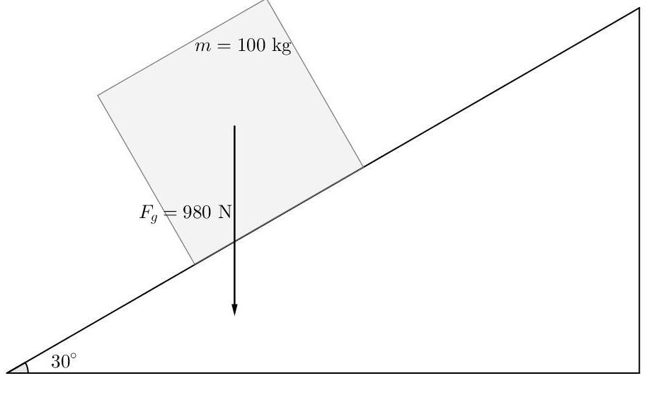 Dans cet exemple, on voit que la force gravitationnelle est vers le bas, mais que le plan incliné est orienté à 30 degrés. Notre système de référence sera donc orienté aussi à 30 degrés. On peut donc séparer la force gravitationnelle en ses deux composantes (la flèche bleue qui est la composante en x et la flèche noire vers la surface du plan incliné est la composante en y):