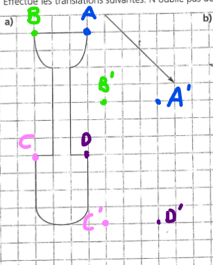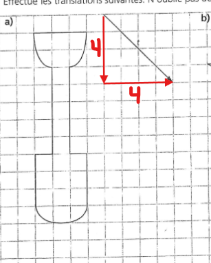 Tu dois suivre les flèches que l'on te donne pour déplacer la figure. Par exemple, au numéro a), la flèche va de 4 unités vers le bas, et 4 unités vers la droite.