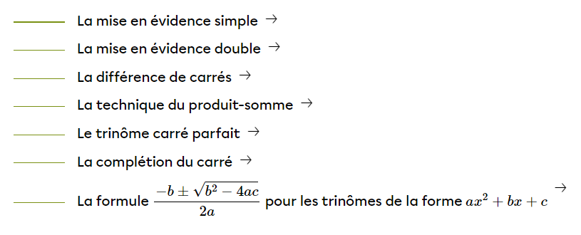 La mise en évidence simple n'est qu'une des nombreuses techniques de factorisation. En effet, il y a diverses techniques de factorisation à utiliser selon la forme du polynôme.