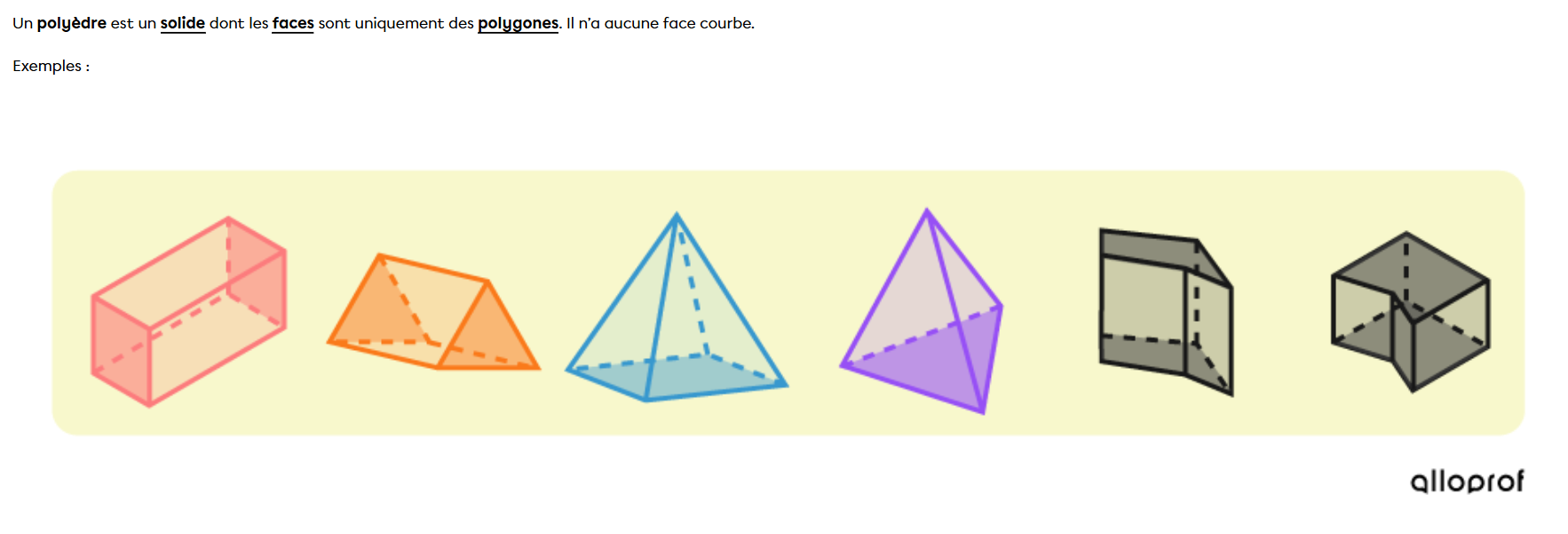 Je te dépose ici ce lien vers les informations sur les polyèdres. https://www.alloprof.qc.ca/fr/eleves/bv/mathematiques/les-polyedres-primaire-m1760