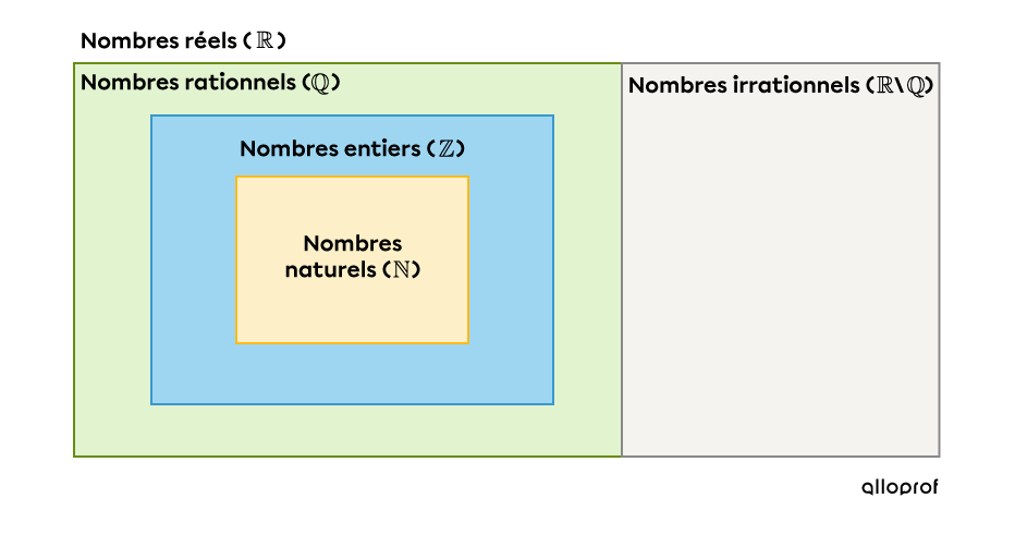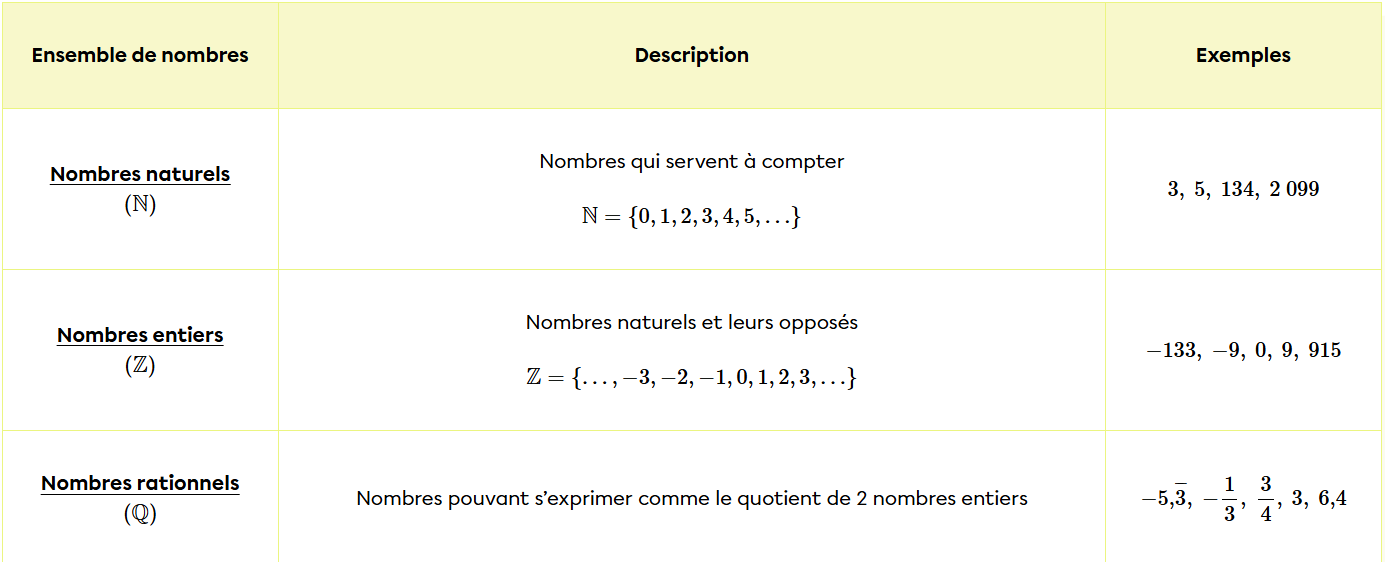 On classe les nombres, en fonction de leurs caractéristiques, en différents ensembles. Voici les différents ensembles :