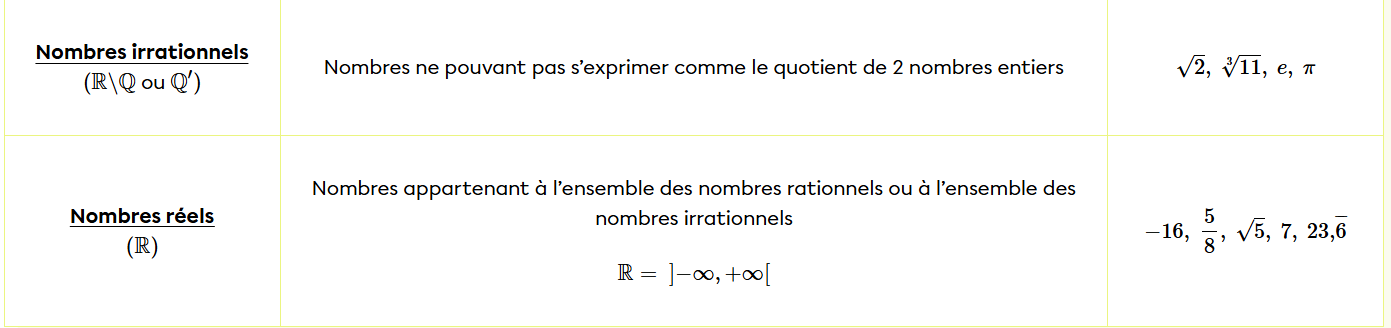 Maintenant, pour t'aider à comprendre, voici un tableau qui donne un aperçu des différents ensembles.
