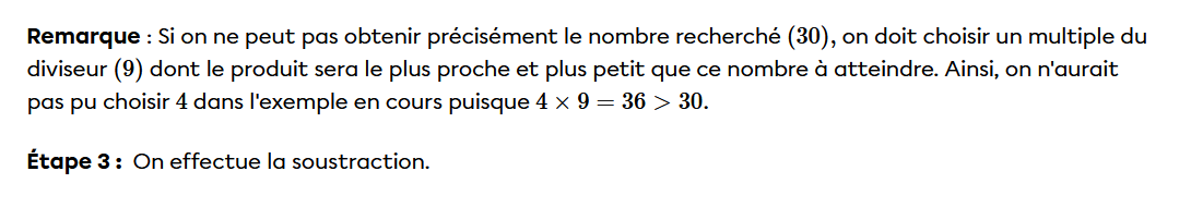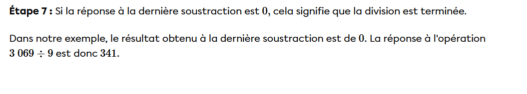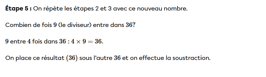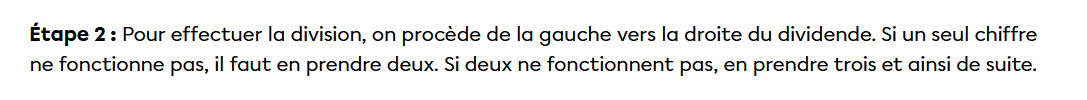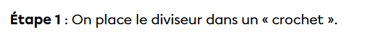 Les grandes étapes sont les suivantes: on place le diviseur dans un « crochet ». Ensuite, pour effectuer la division, on procède de la gauche vers la droite. Si un seul chiffre ne fonctionne pas, il faut en prendre deux. Si deux ne fonctionnent pas, en prendre trois, etc.
