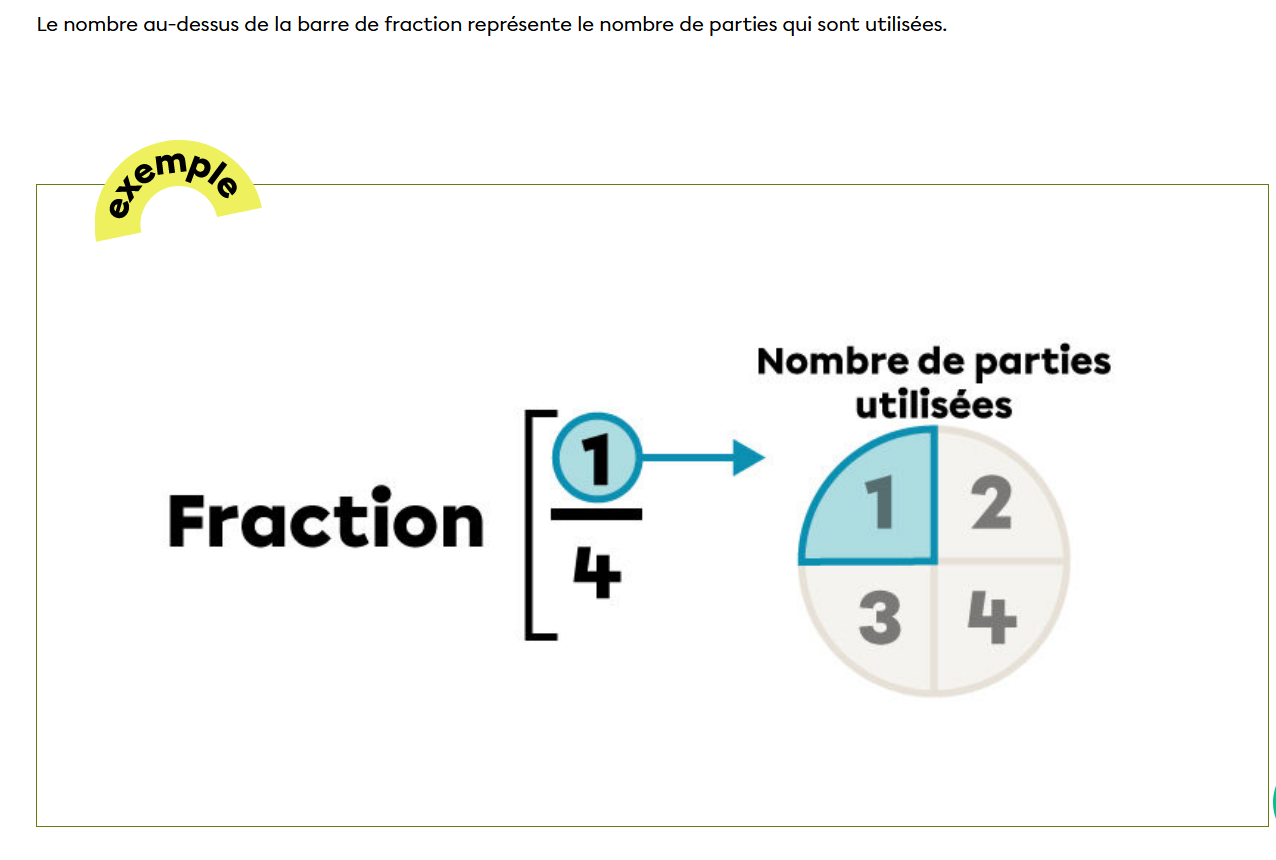 Un fraction, c'est une division. Par example, tu as une sandwich et t'aimerais en partager avec ton ami. Alors tu le divises en 2 et t'en donne un morceau à ton ami. Alors chacun de vous aura 1/2 du sandwich. Même chose pour 4, etc