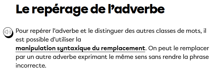 Tu peux aller voir cette fiche si tu veux plus de détails sur le remplacement : https://www.alloprof.qc.ca/fr/eleves/bv/francais/l-adverbe-f1229 si tu ne veux pas tout, tout lire... il y a un vidéo dans le bas de la fiche! ;)