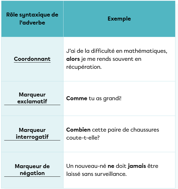 La difficulté avec les adverbes c'est qu'ils peuvent avoir différentes formes et différents rôles dans la phrase, voici quelques exemples :