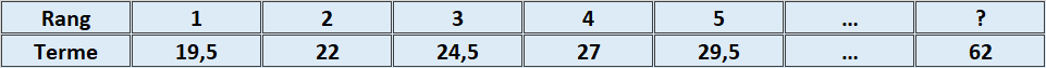 Le rang 1 c'est 19.5(Terme), le rang 2 c'est 22(Terme), le rang 3 c'est 24.5(Terme), le rang 4 c'est 27(Terme), le rang 5 c'est 29.5 ainsi de suite.