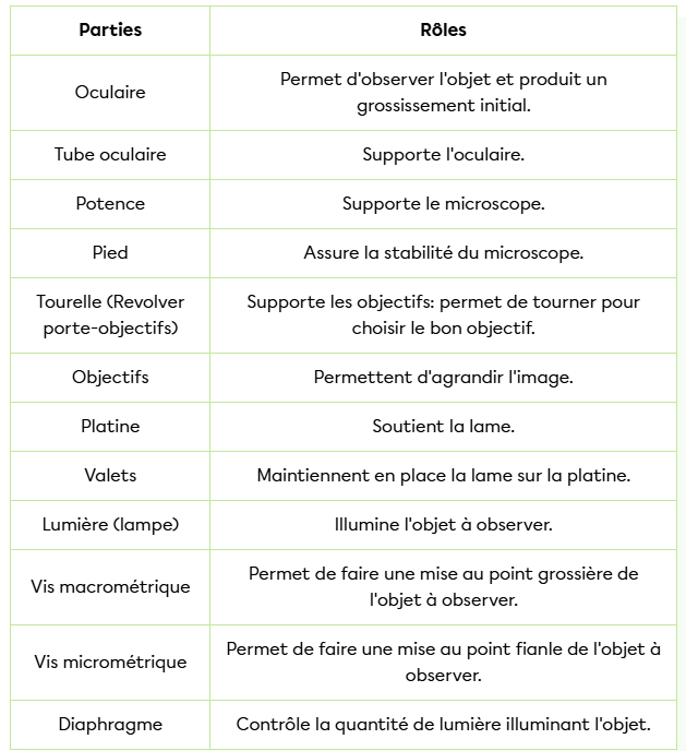 Voici les différentes parties d’un microscope :