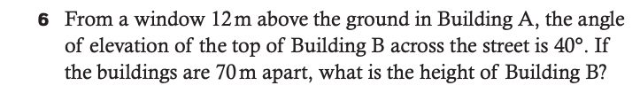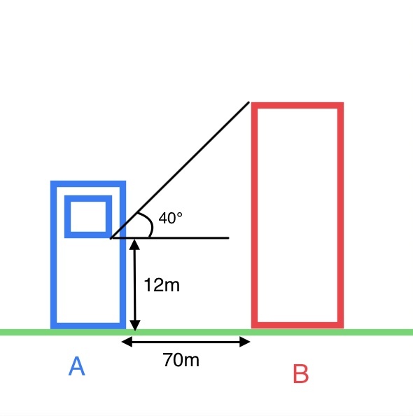 Le bâtiment A est en bleu, tandis que le B est en rouge. Ceux-ci sont séparés de 70 m (the buildings are 70 m apart). La fenêtre est à 12 m du sol (window 12m above the ground). L'angle d'élévation du toit du bâtiment B du point de vue de la fenêtre est de 40 degrés (From a window in building A, the angle of elevation of the top of building B is 40 degrees).