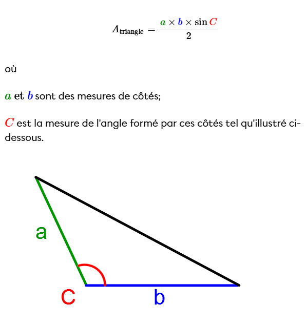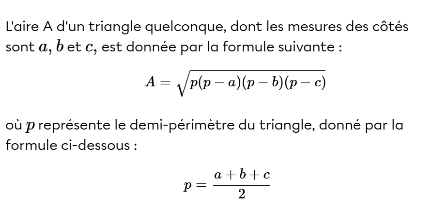 Finalement, pour trouver l'aire du triangle, tu peux utiliser la formule de Héron :
