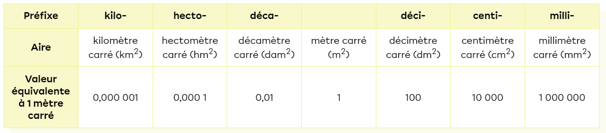 Comme tu peux le voir sur le tableau, si tu veux passer de mètre carré à décimètre carré, tu dois multiplier ton résultat par 100. À l'inverse, si tu veux passer de décimètre à mètres, tu dois diviser ta valeur par 100. Bref, le truc est de se fier au tableau et, lorsque tu vas de gauche à droite dans le tableau, tu multiplies, et, lorsque tu vas de droite à gauche, tu divises. Il y a un facteur de 100 entre chaque unité, car ici, c'est des unités au carré.