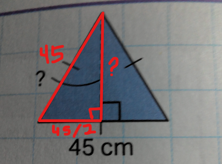 Tu peux alors utiliser le théorème de Pythagore pour trouver la mesure de la cathète, qui est la hauteur du triangle équilatéral.