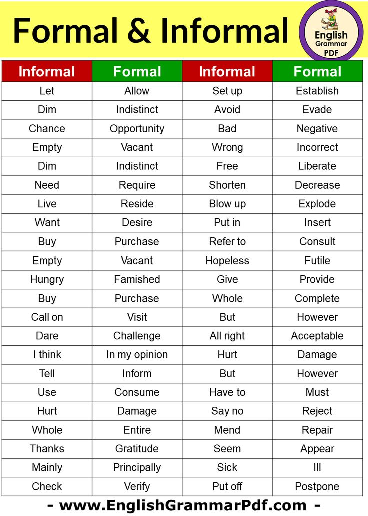 Voici quelques exemples de mots formels vs informels en anglais que tu peux utiliser dans une lettre ou dans un texte: