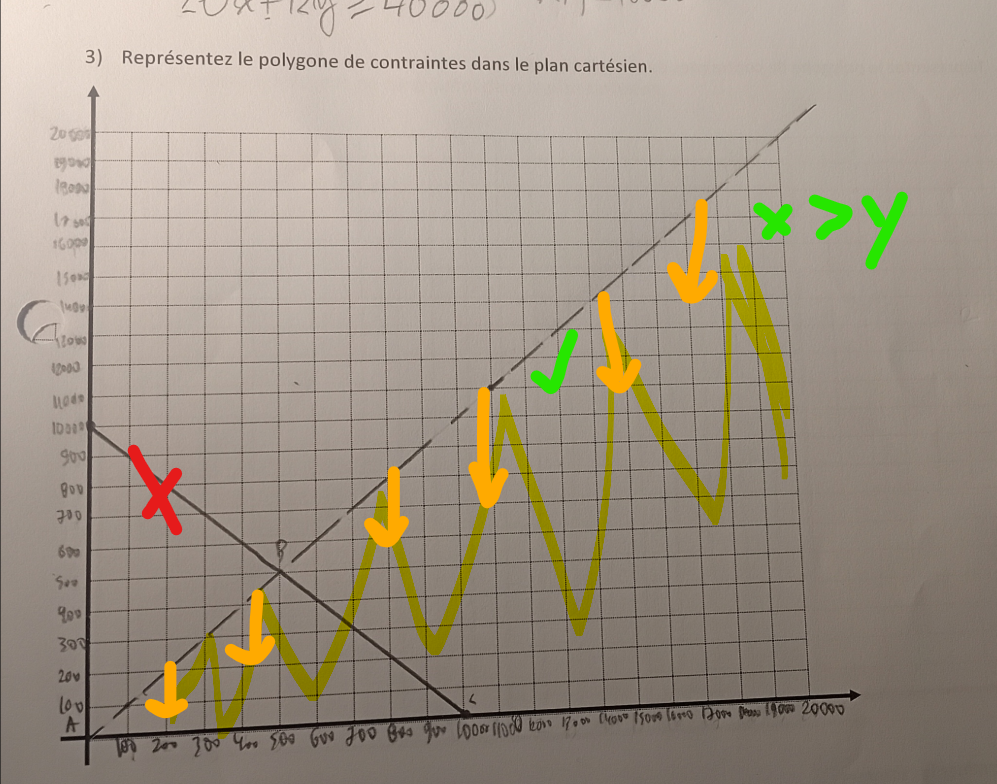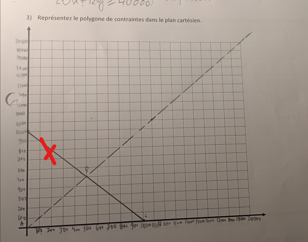 Cependant, on ne dit pas dans l'énoncé que le nombre total de coupes homme et de coupes femme est de 10 000, donc l'équation x+y=10 000 est fausse. Tu dois donc enlever cette droite du graphique :