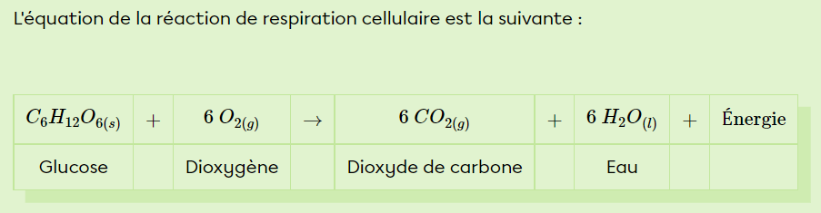 • La respiration cellulaire est la même réaction qui se produit dans notre corps lorsque nous respirons. Un des gaz que nous expirons est le dioxyde de carbone, tout comme un des extrants de la respiration cellulaire.