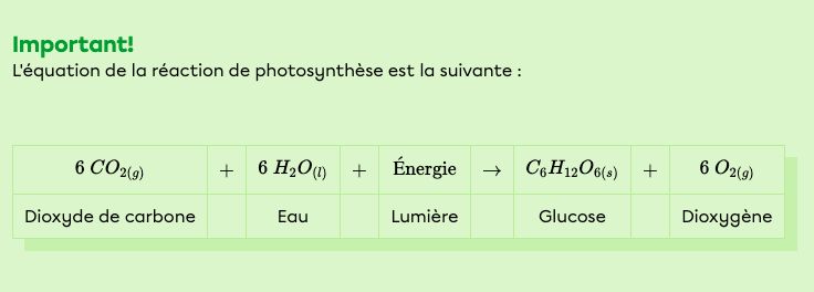 Tout d'abord, la réaction de photosynthèse et la réaction de respiration cellulaire sont deux réactions inverses. En d'autres mots, les intrants de l'une sont les extrants de l'autre, et vice-versa.
