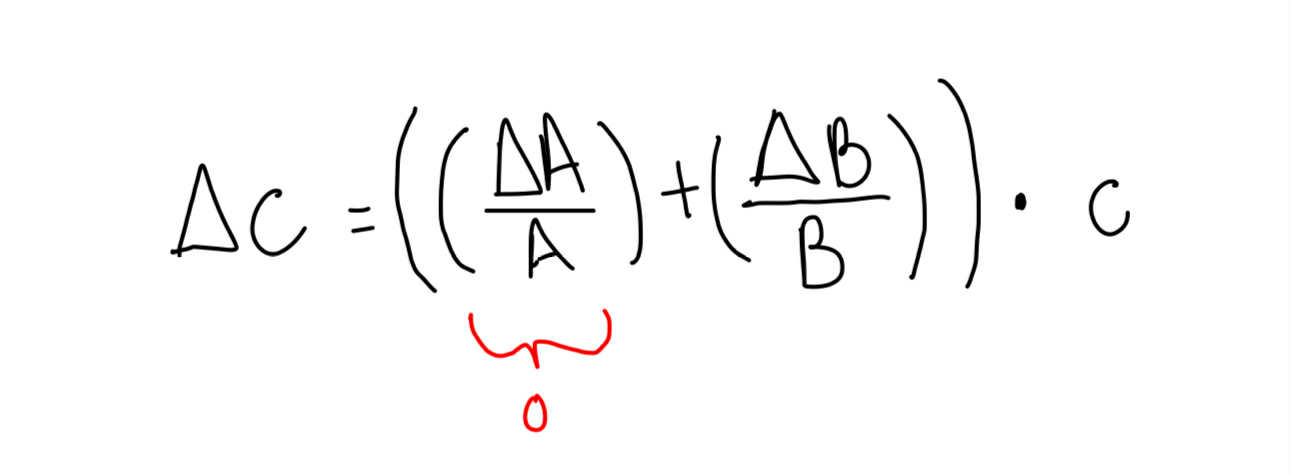 Imaginons que A est la valeur sans incertitude et que l'on cherche l'incertitude de C (le résultat de la multiplication de A et B). Étant donné que A n'a pas d'incertitude, toute la parenthèse disparait. Il ne te reste qu'à remplacer les valeurs par ce que tu connais pour obtenir ta réponse.