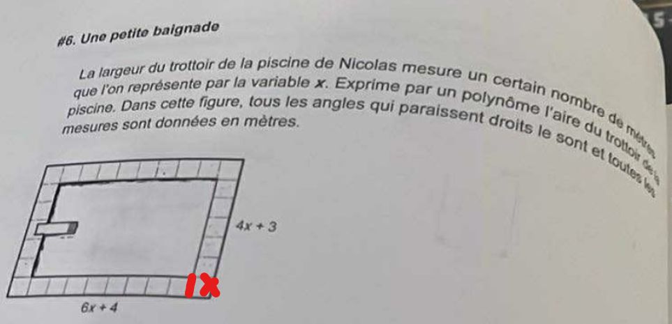 Ensuite, concernant le numéro 6, on te dit que la largeur du trottoir est de x.