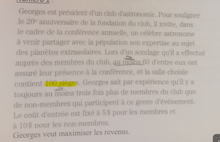 De plus, la salle contient 100 sièges. On ne peut donc pas avoir un nombre de participants supérieur à 100, puisqu'il n'y aurait pas de place. Je te laisse trouver l'inéquation correspondante.