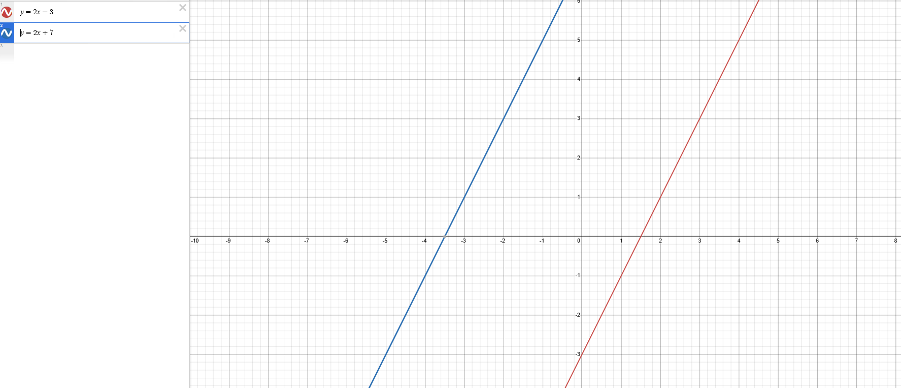 On peut arriver à cette conclusion en comparant leur pente. On voit que les pentes des deux droites sont toutes les deux de 2. Donc, puisque les droites ont la même pente, elles sont parallèles!