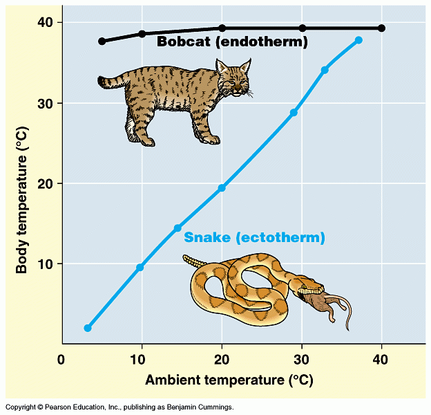 Le graphique suivant t'indique la différence principale entre des deux types d'êtres vivants. Pour l'endotherme, sa température corporelle reste plus ou moins constante par rapport à la température extérieure, pour l'ectotherme, sa température augmente en fonction de la variation de celle à l'extérieur dans son environnement.
