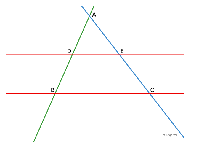 Le théorème de Thalès est applicable seulement dans le cas d'une figure formée par des sécantes qui croisent des droites parallèles. Comme celle-ci :