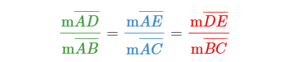 Donc, la mesure de ton segment AD, sur les images ci-dessus, divisées par la mesure de ton segment AB, est égale à la mesure de ton segment AE sur la mesure de ton segment AC. Aussi, cette égalité est vraie pour la mesure de DE sur BC.