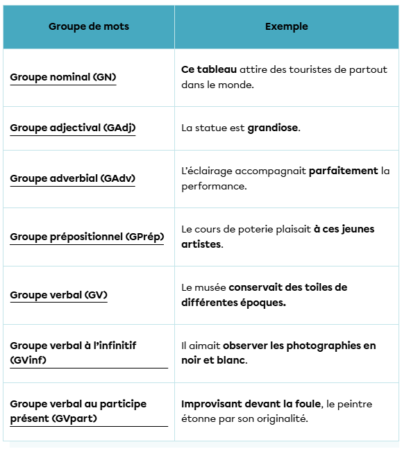 Les groupes de mots qui composent une phrase varient en fonction du noyau (le mot le plus important) de chacun de ces groupes.
