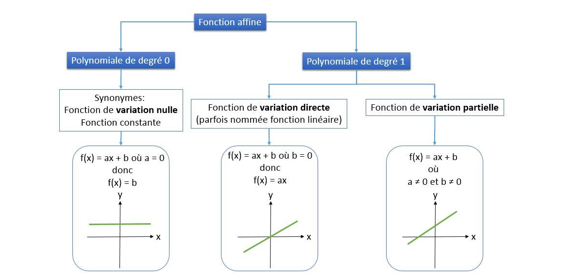 Ces trois types de fonctions sont toutes des fonctions affines (en plus simple, ce sont des droites dans un graphique).