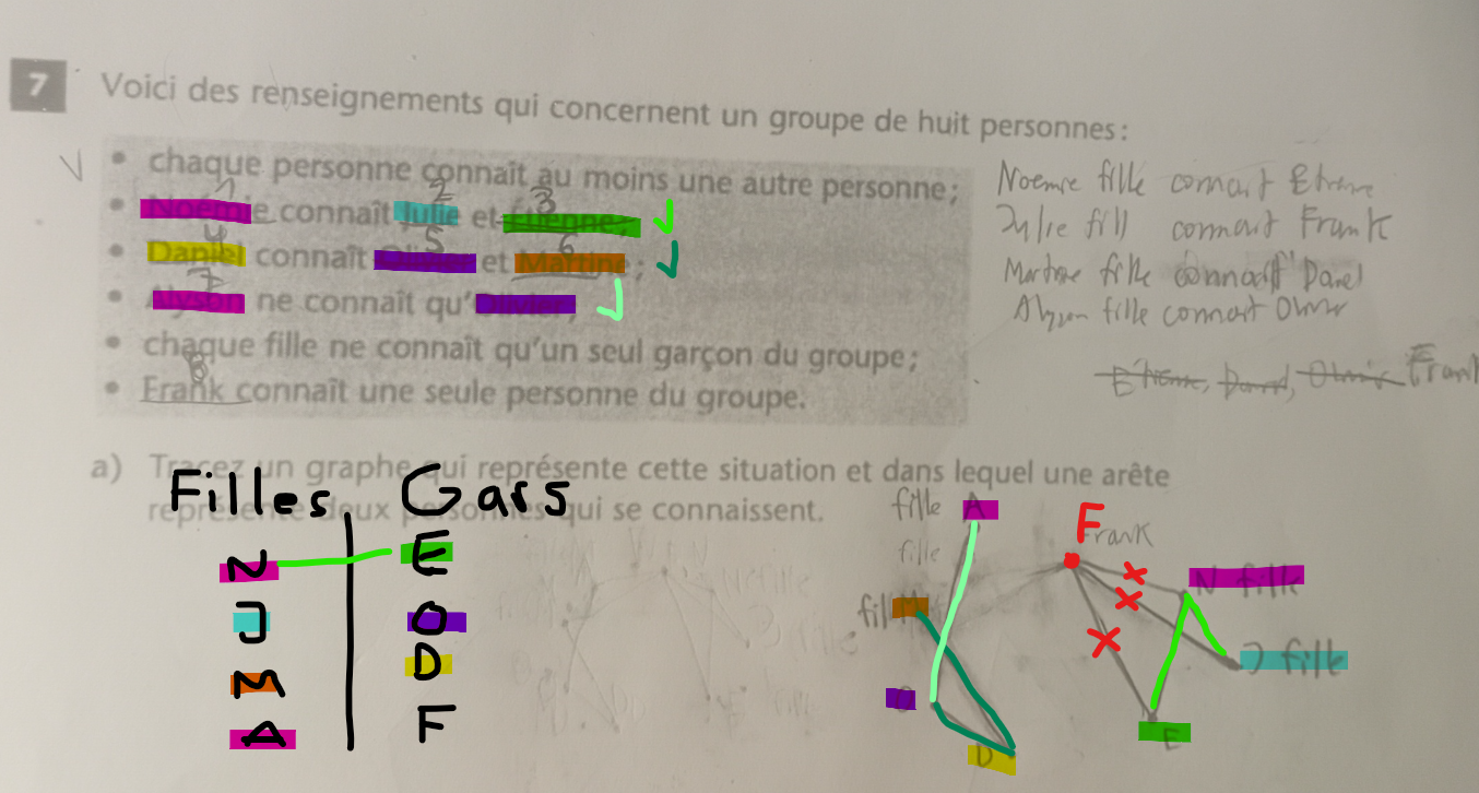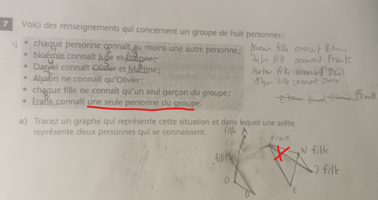 Bonjour Katia j'ai besoin de votre aide. J'étais sur votre explication. Frank connaît qu'une seule personne du groupe. J'ai eu de la difficulté à trouver qui Frank connaissait puisque je n me trouvais aucun lien. Donc, j'ai vu que j'ai relié Frank à Étienne et je ne sais pas pourquoi. En ce qui concerne les filles, j'ai finalement trouvé 2 filles qui connaissaient un seul garçon du groupe. Noemie connaît Étienne et Alyson connaît Olivier. Mais les deux filles Julie et Martine, j'ai eu de la difficulté à trouver quels garçons elles connaissaient. Ça disait que Daniel connaissait Martine. Je ne sais pas si cela veut dire aussi que Martine connaît Daniel donc c'était déjà relié et Julie. Je n'ai pas trouvé quel garçon Julie connaissait mais puisque les trois garçons ont barré en procedure par élimination. Il ne restait que d9nc j'ai constaté que Julie connaissait Frank donc j'ai relié de Julie à Frank celui que vous m'avez dit qui n'était pas correct ?