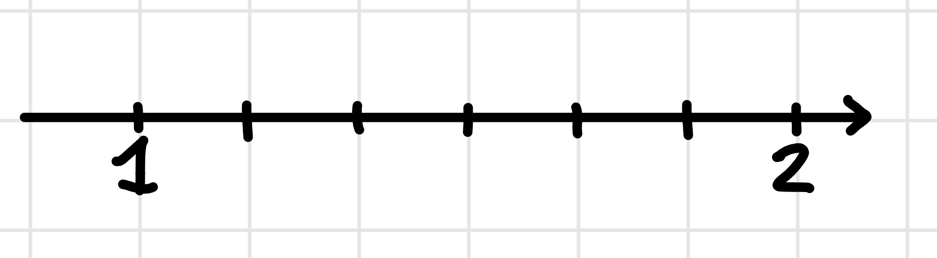 Supposons qu’on place déjà pour toi deux nombres, comme dans cet exemple où la ligne numérique commence à 1 et se termine à 2. Entre ces deux nombres, on voit plusieurs petites graduations identiques. Tu dois donc trouver quelle est la valeur d’un seul pas de graduation.