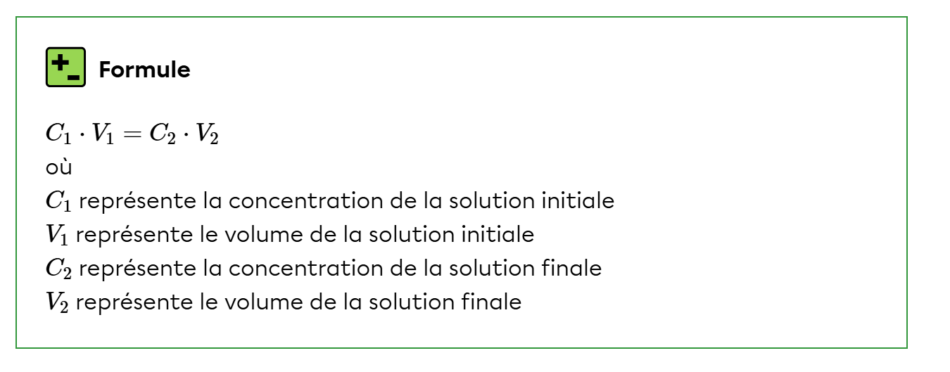 La formule C1V1 = C2V2 sert surtout quand on parle de dilution. C'est quand on prend une solution concentrée et qu’on ajoute de l’eau pour la rendre moins concentrée. L’idée importante à comprendre, c’est que la quantité de soluté ne change pas, même si on ajoute de l’eau. On ne crée pas de soluté et on n’en enlève pas, on fait juste le répartir dans un plus grand volume.