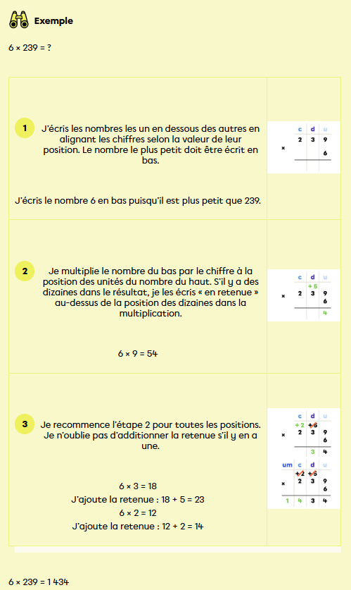 3. Je recommence l’étape 2 pour toutes les positions. Je n’oublie pas d’additionner la retenue s’il y en a une.
