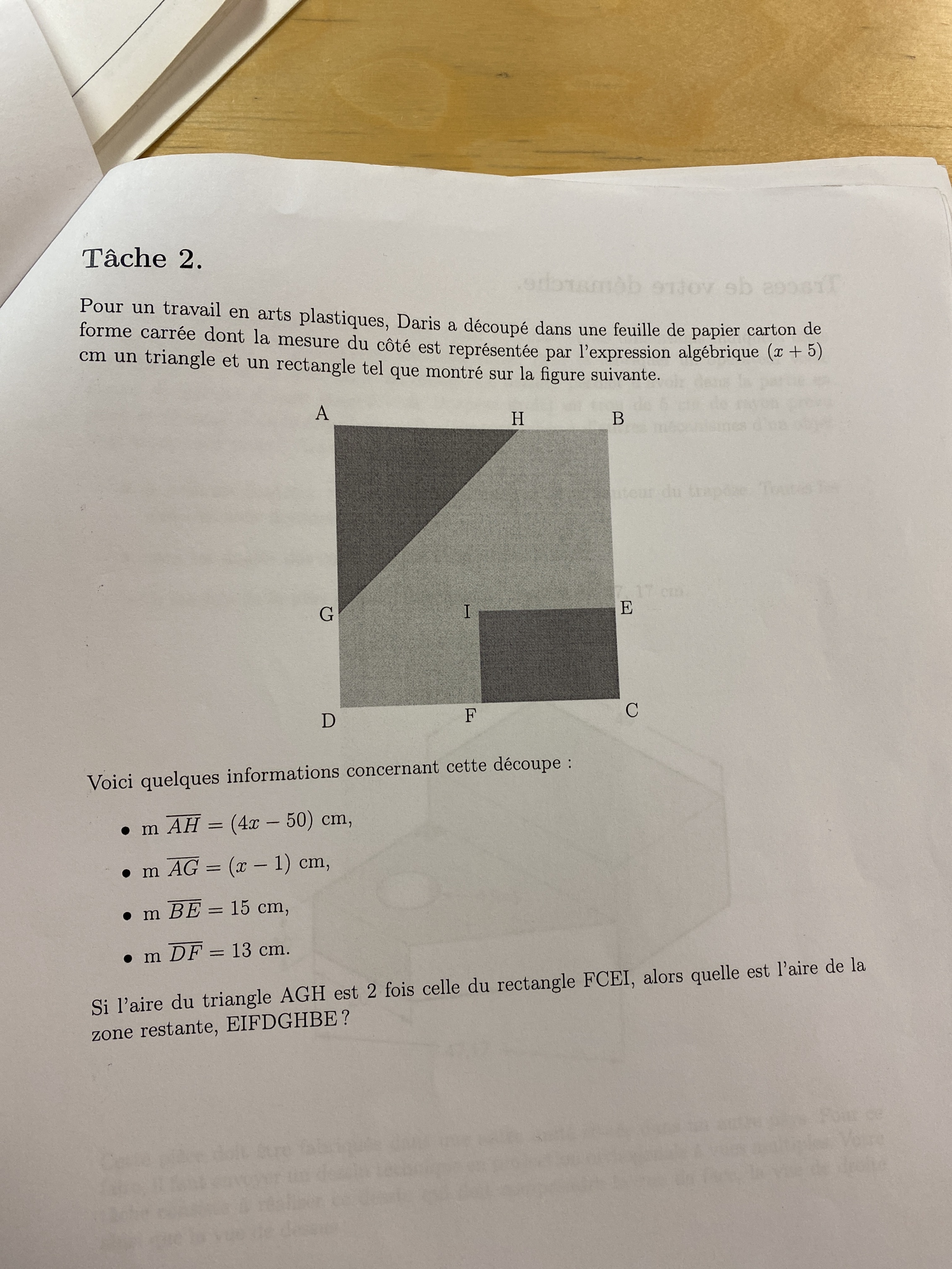 Ensuite, tu dois soustraire les aires du carré et du triangle que je t'invite à calculer toi-même en te fiant aux formules que tu peux trouver ici :