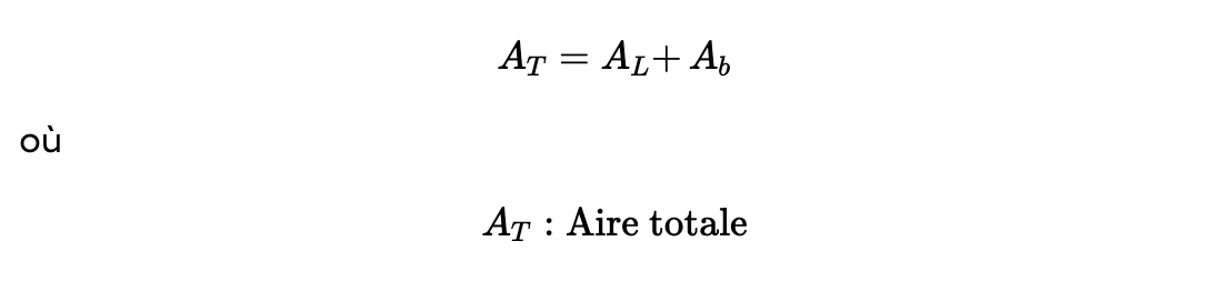 Nous avons déjà dans la question l'aire de la base qui est de 1,69 m^2. Cependant, il faut faire attention puisque les unités de l'aire total et de l'aire de la base sont différentes. On peut donc transformer l'aire total en m^2. On obtient donc que 403 dm^2 = 4,03 m^2. La formule devient donc 4,03=Aire latérale+1,69. Ainsi, en isolant l'aire latérale on obtient que Aire latérale = 2,34m^2