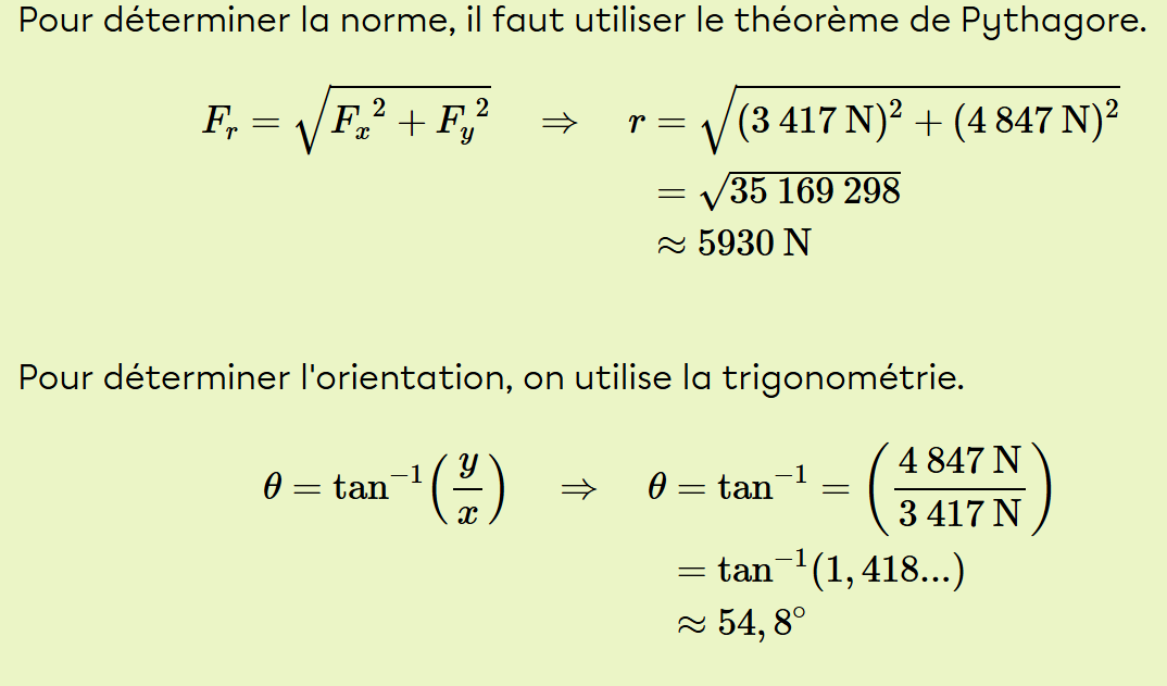 Jusqu'à ce moment, tu as bien compris le problème. Tu dois additionner les 3 forces pour trouver la force résistante et son orientation, et pour garder le système à l'équilibre, la 4e force doit être de la même grandeur et à l'opposé.
